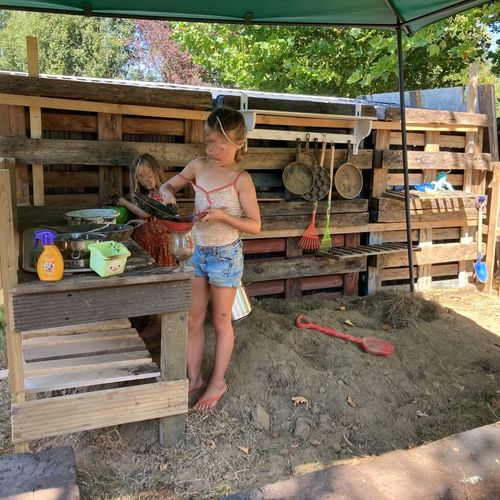 We werken buiten in en met de natuur; ik heb m'n eigen geborgen plek ingericht om buiten te leren en expermimenteren: klimmen, hout hakken, vuur maken, kampen bouwen, diertjes verzorgen.